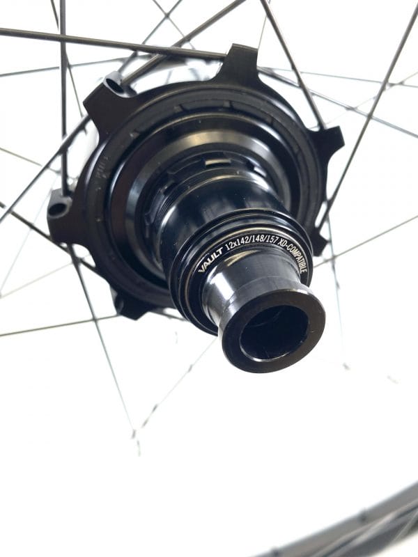 Die Vault Nabe verfügt über werkzeuglos austauschbare Endkappen um möglichst schnell zwischen verschiedenen Achsstandards wechseln können. Die Oversize Nabengehäuse beherbergen mit die größten Kugellager am Markt und versprechen somit lange Haltbarkeit. Die großen Speichenflansche sind optimal platziert um die Seitenstabilität zu maximieren.